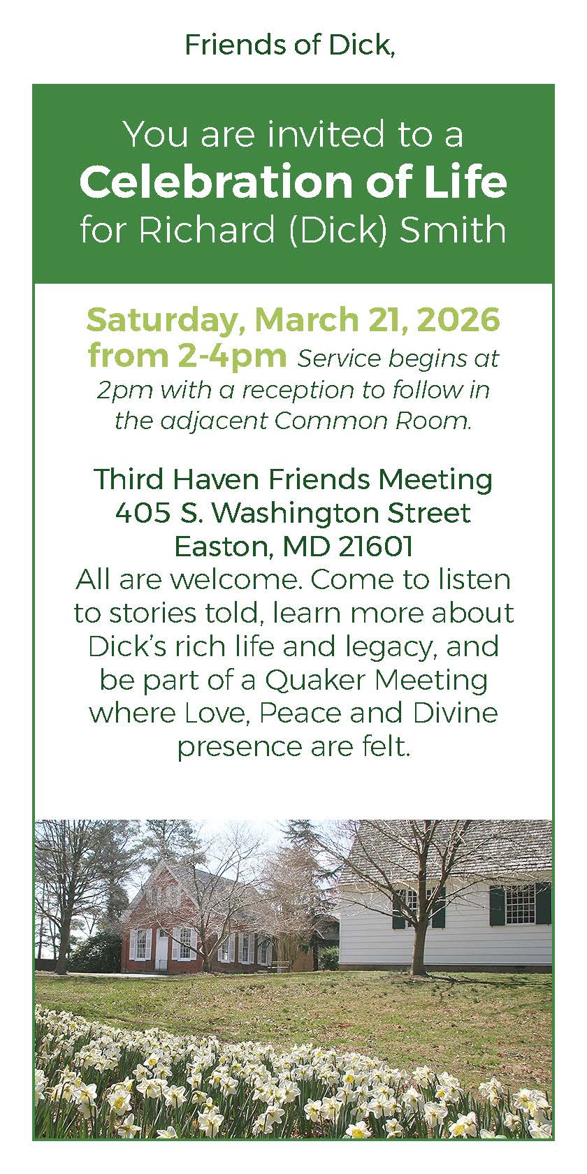 - March 21 (Saturday) 2-4PM: Dick Smith Celebration of Life Meeting for Worship